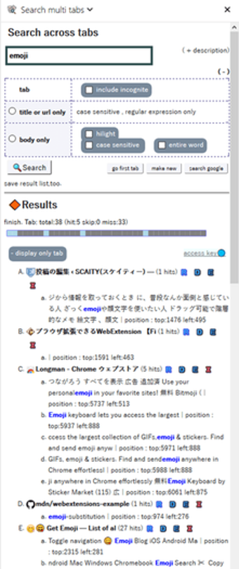 Search Multi Tabs är ett praktiskt tillägg för Firefox som förenklar sökningen av webbsidor och titlar genom att skapa en klickbar lista över träffar. Användare kan snabbt navigera till relevanta delar av en sida, där träffarna markeras med färg för att underlätta identifiering. Med funktioner som tabborttagning och omladdning, samt visning av favicons, erbjuder detta tillägg en smidig användarupplevelse. Det stödjer även snabb sökning via Google med hjälp av kortkommandon som Alt+Enter.